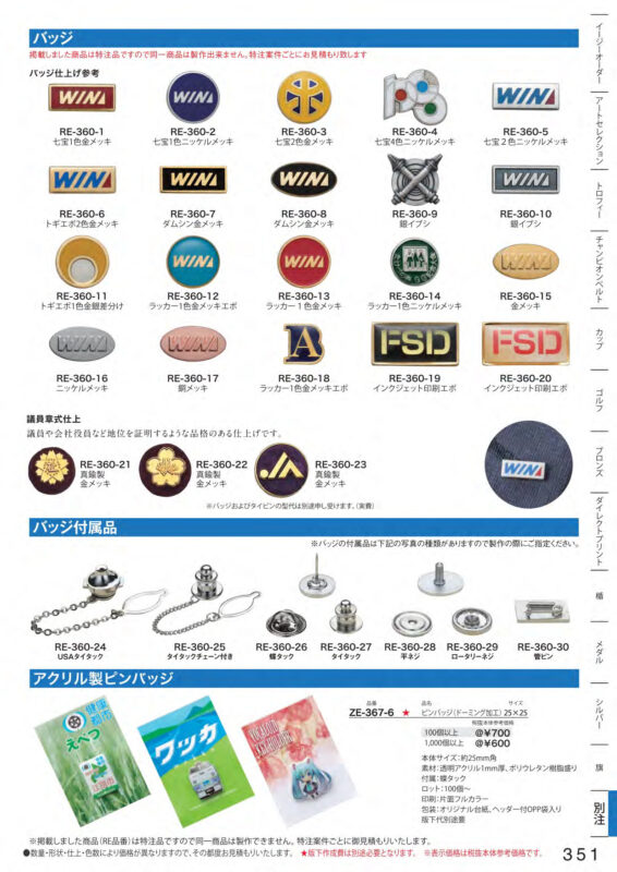 | RE-360-1~360-20 七宝1色金メッキ、七宝1色ニッケルメッキ、七宝2色金メッキ、七宝4色ニッケルメッキ、七宝2色ニッケルメッキ、トギエポ2色金メッキ、ダムシン金メッキ、銀イブシ、トギエポ1色金銀差分け、ラッカー1色金メッキエポ、ラッカー1色金メッキ、ラッカー1色ニッケルメッキ、金メッキ、ニッケルメッキ、銅メッキ、インクジェット印刷エポ  |
